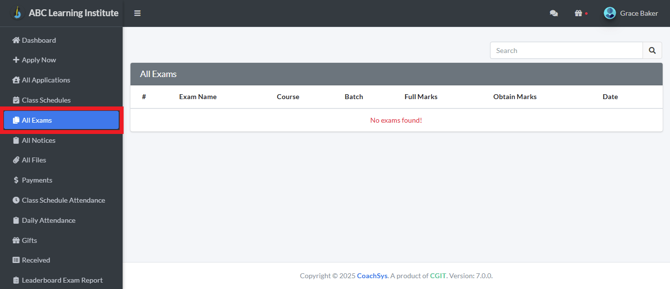 এই মেন্যুটি আপনার ভর্তি হওয়া প্রতিষ্ঠানের সমস্ত পরীক্ষা সংক্রান্ত তথ্যের একটি সম্পূর্ণ তালিকা দেখায়। এখানে আপনি আসন্ন পরীক্ষাগুলির সময়সূচী এবং ইতিমধ্যে অনুষ্ঠিত হওয়া পরীক্ষাগুলির ফলাফল উভয়ই দেখতে পাবেন। প্রতিটি পরীক্ষার জন্য তার নাম, কোর্স, ব্যাচ, Full Marks (পূর্ণ নম্বর), Obtain Marks (প্রাপ্ত নম্বর), এবং Date (তারিখ) এর মতো গুরুত্বপূর্ণ তথ্য প্রদর্শিত হয়। ওপরে থাকা সার্চ অপশন ব্যবহার করে আপনি আপনার প্রয়োজন অনুযায়ী নির্দিষ্ট পরীক্ষাগুলি অনুসন্ধান করতে পারবেন।